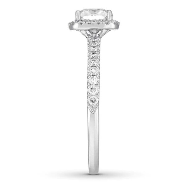 Boasting an impressive 2 carats in total diamond weight, this eye-catching diamond engagement ring is fahsioned in 10K white gold and features stunning round diamonds forming its pear-shaped center. Additional round diamonds halo the center and beam down the band with baguette diamonds in between.