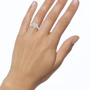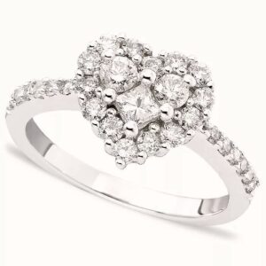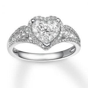 A gorgeous symbol of your love, this sparkling bridal set from features an engagement ring with a romantic heart-shaped diamond haloed by glimmering round diamonds. The band and matching wedding ring are adorned with twists of round diamonds, bringing the total weight of the set to 7/8 carat. The ring is styled in 14K white gold.