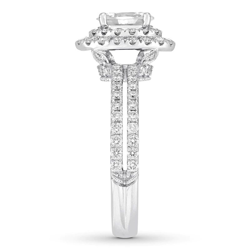 Engagement ring embraces the modern beauty of the halo design. The brilliant 1-carat oval-shaped diamond center reflects passion for vintage designs, while round diamonds add sparkle to the split-shank band. The diamonds total 1 3/4 carats in weight.