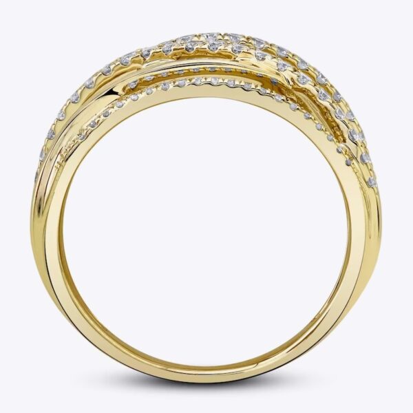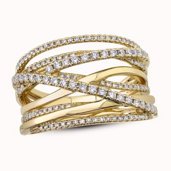 Brilliant round diamonds line multiple stacked and interwoven bands in this stunning, fashion-forward women’s ring from the collection. Fashioned in 14K yellow gold the total diamond weight of the ring is 5/8 carat.