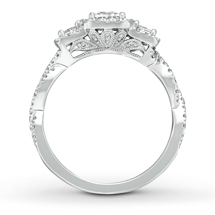 This engagement ring from showcases three dazzling princess-cut diamonds haloed by smaller round diamonds. Twists of diamonds adorn the 14K white gold band, bringing the total diamond weight to 1 1/8 carats.